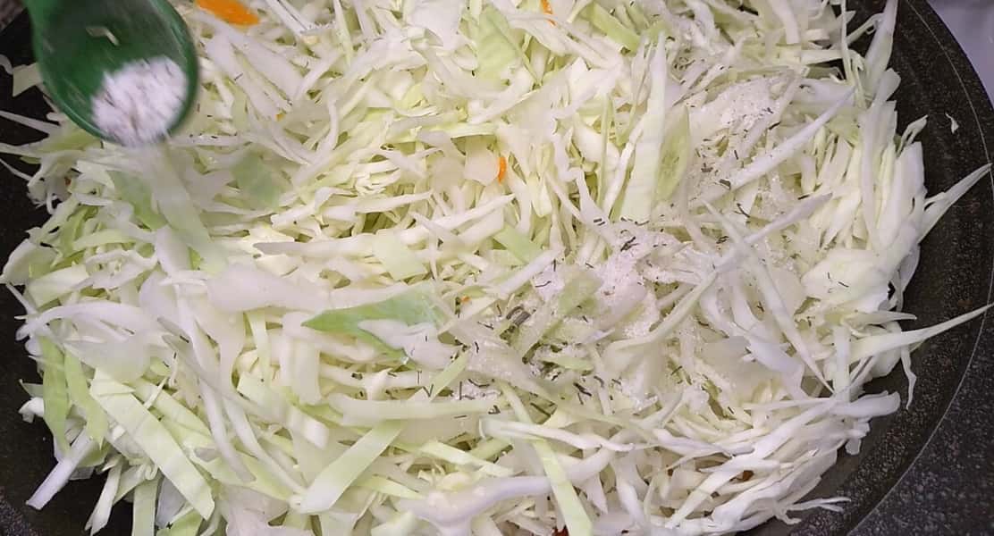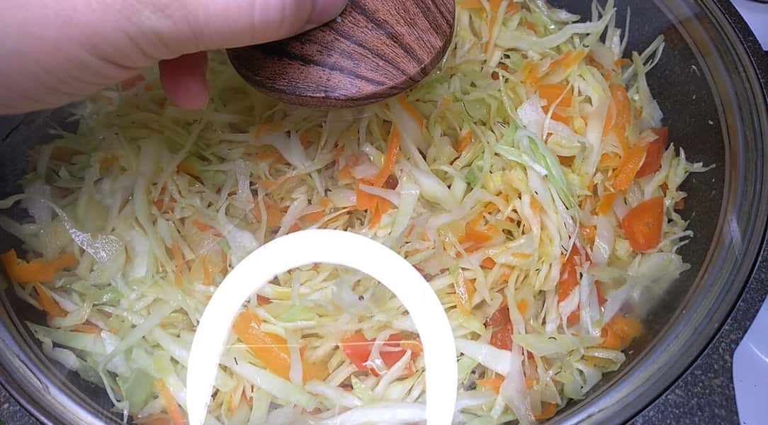 До обсмажених овочів додаємо нашатковану капусту, солимо за смаком, перемішаємо і тушимо під кришкою 10 хвилин, помішуючи періодично.
