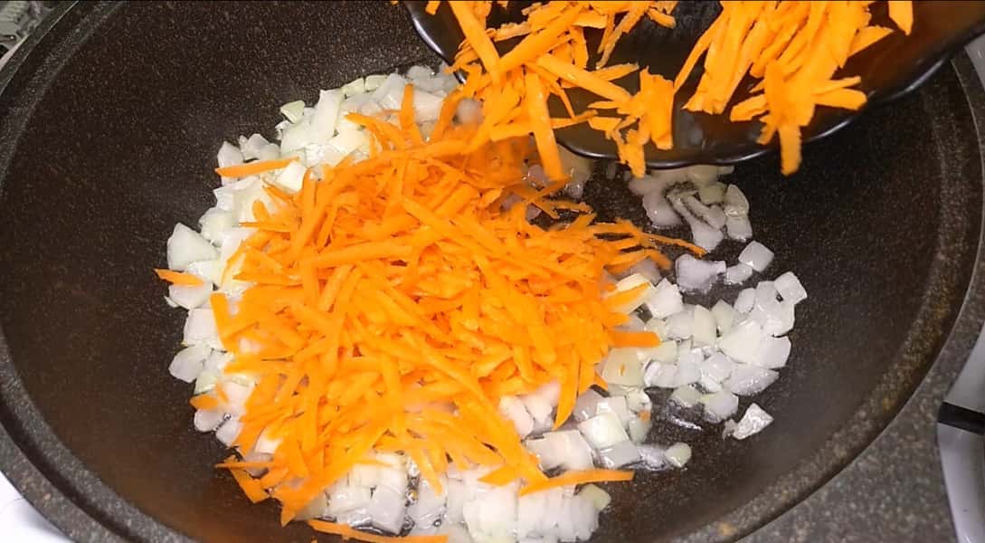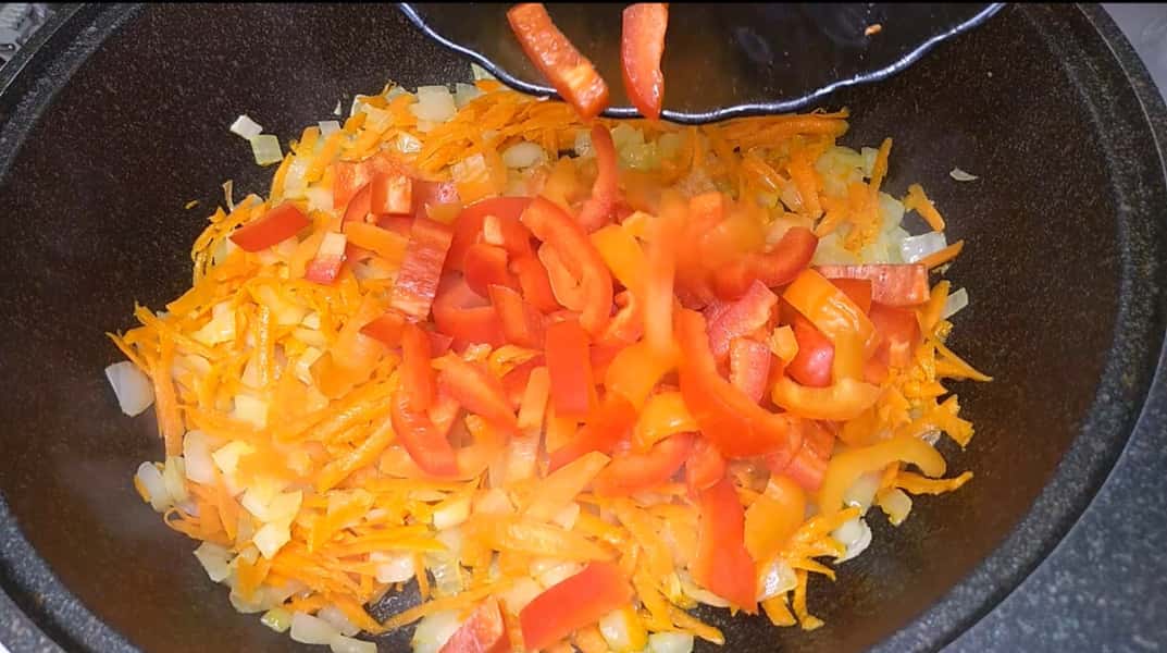 На розігріту з олією сковороду відправляємо дрібним кубиком нарізану цибулю смажимо помішуючи 1 хвилину, потім додаємо моркву натерту на великій тертці, перемішуємо і смажимо 1-2 хвилини, потім додаємо дрібною соломкою нарізаний болгарський перець, смажимо 1-2 хвилини.