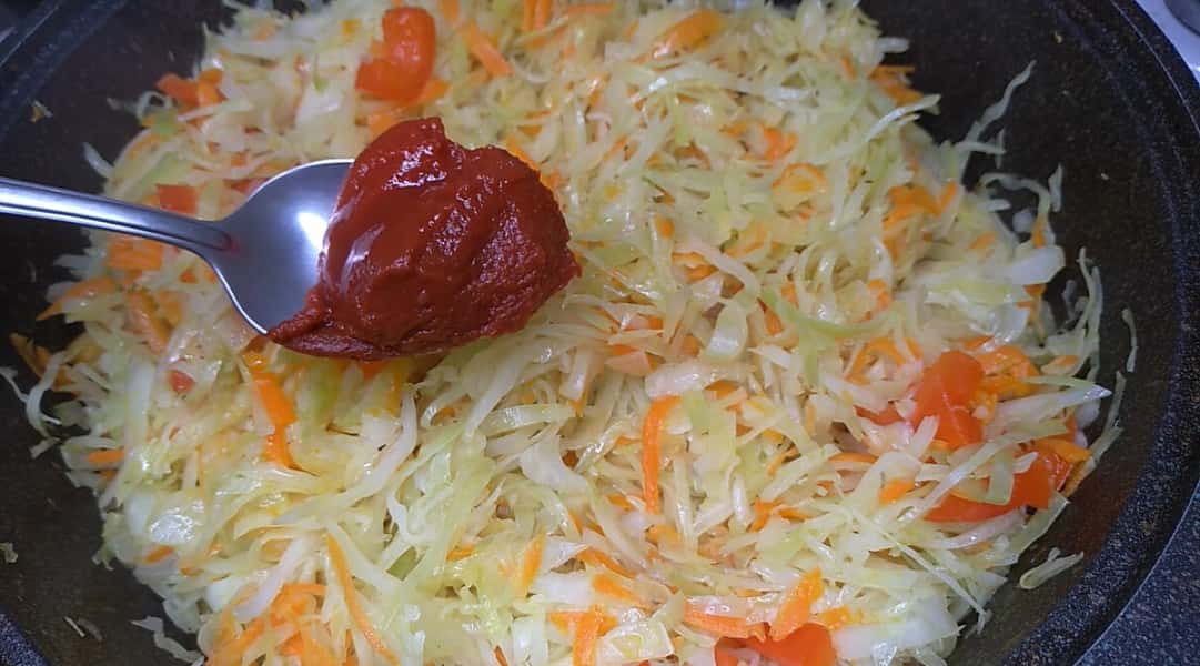 Потім додаємо томатну пасту, перемішуємо і тушимо ще 10 хвилин.