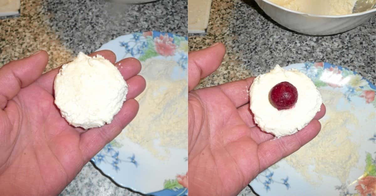 - У центр коржа покладіть вишню. Щоб вони не деформувалася, заздалегідь обсипте ягоди цукровою пудрою або крохмалем. Загорніть вишню в тісто, скачайте виріб у кульку.