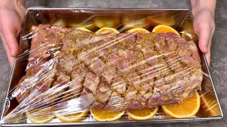- На лист викладаємо подушку з апельсинів, зверху кладемо наше м’ясо, накриваємо харчовою плівкою і прибираємо маринуватися в холодильник на 6-8 годин.