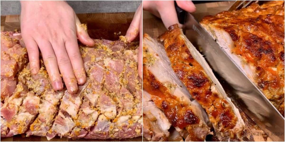- На м’ясі робимо надрізи навхрест і рясно змащуємо і втираємо маринад з усіх боків.