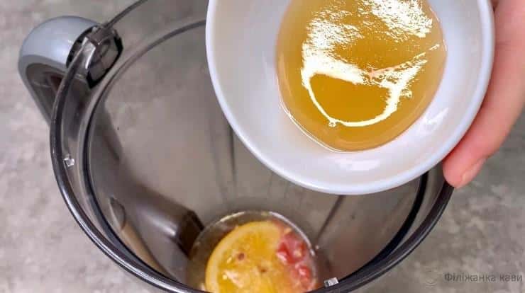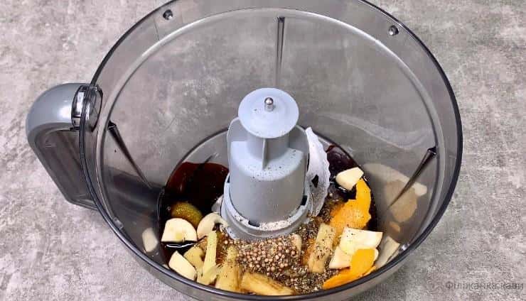 - У чашу блендера відправляємо цедру апельсинів, пару зубчиків часнику, імбир, орегано, коріандр, сіль та чорний мелений перець. Вливаємо оливкову олію, соєвий соус і перемелюємо до повної однорідності.