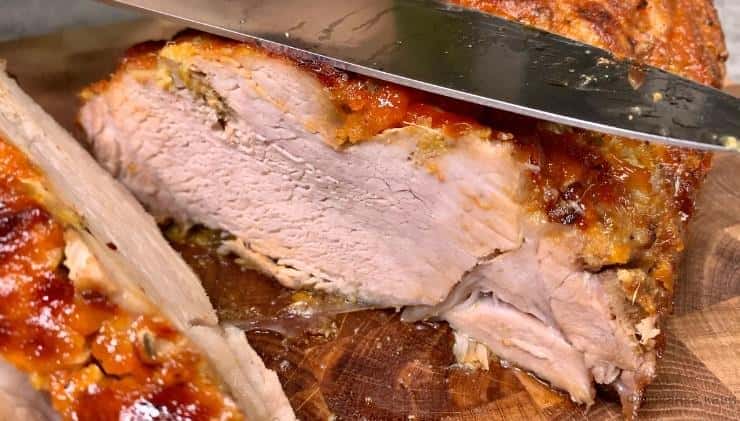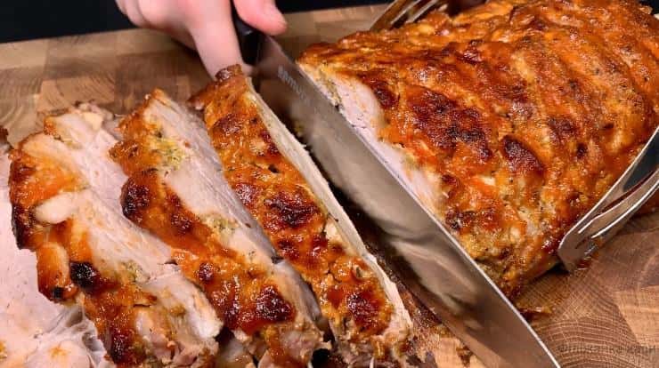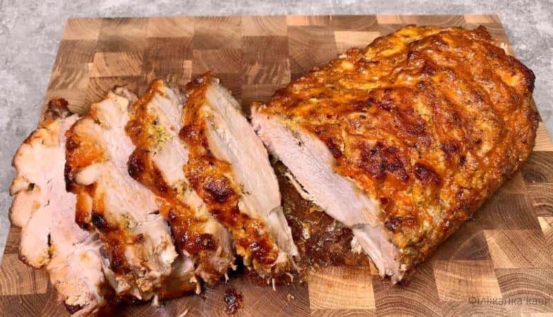 За рахунок невеликої температури та тривалого запікання м’ясо всередині вийде максимально соковитим.