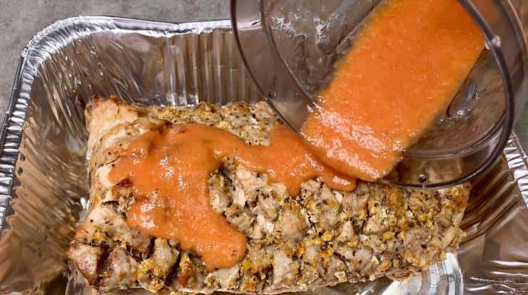 - Через 3 години дістаємо м’ясо, прибираємо фольгу і перекладаємо в іншу форму. Для глазурування в чашу блендера вливаємо сік, що виділився в процесі запікання, томатний кетчуп і мед. Закладаємо кружальце апельсина, на якому запікалося м’ясо, додаємо дрібку солі і перемелюємо в кашу.