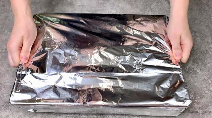 - Після маринування прибираємо плівку, накриваємо фольгою, залишаючи всередині повітряну кишеню, і відправляємо запікатись у розігріту до 150 градусів духовку на 3 години.