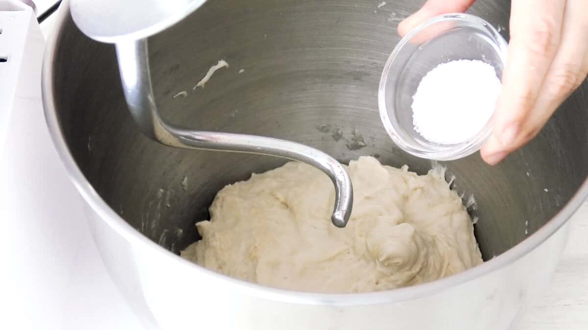 Далі продовжити заміс тіста. Додати в нього сіль і вимішувати до повного розподілу її в тісті.