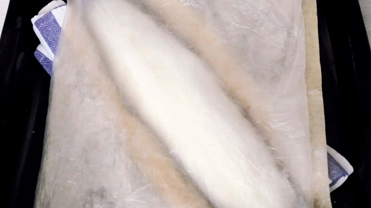 Викласти заготівлю на деко швом вниз. З боків укласти валики з рушників, щоб заготівля під час вистоювання не розповзлася. Накрити зверху плівкою і рушником, залишити на розстойку на 1.5-2 години в залежності від температури у вашій кімнаті.