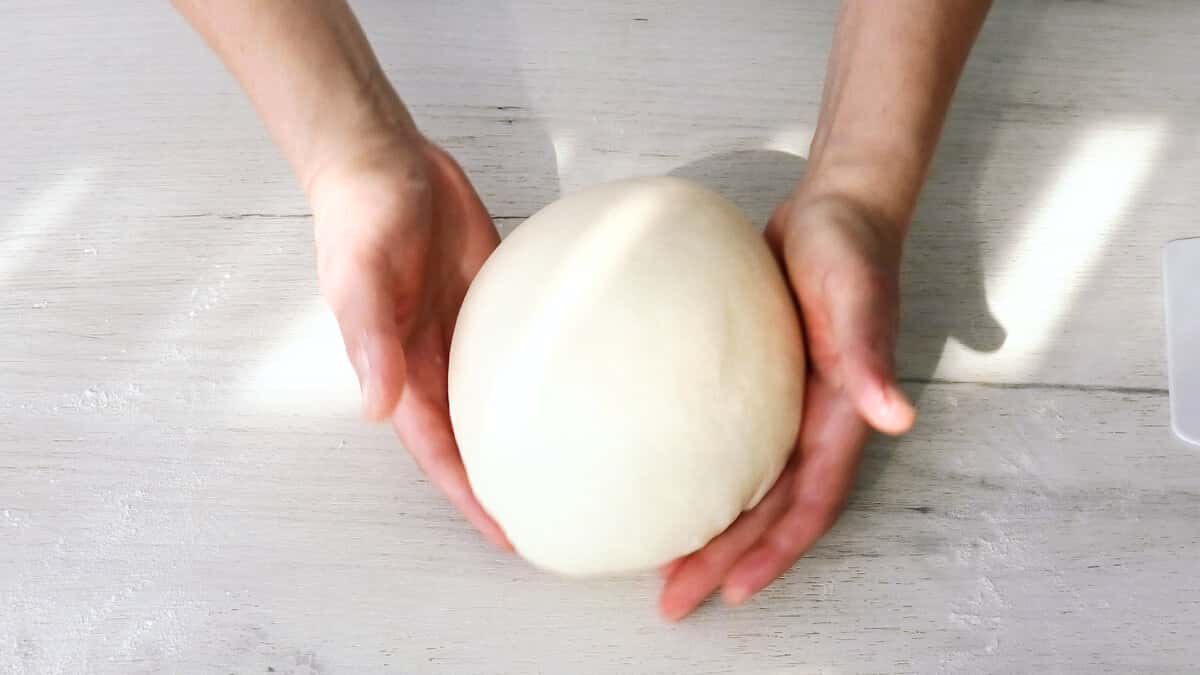 Викласти його на стіл. Зібрати краї до центру, прибрати всі великі бульбашки повітря і округлити.
