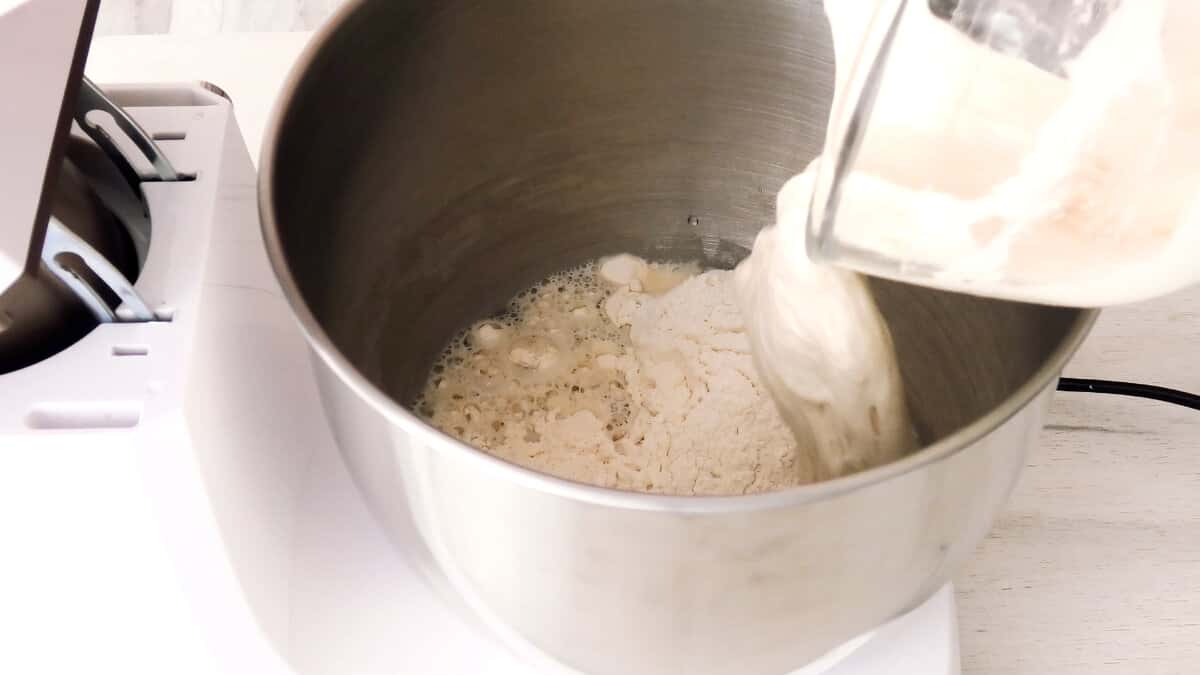 У чашу міксера викласти борошно, влити воду і відміряти 200 гр готової опари. На першій швидкості замісити тісто близько 1-2 хвилин до зволоження борошна.