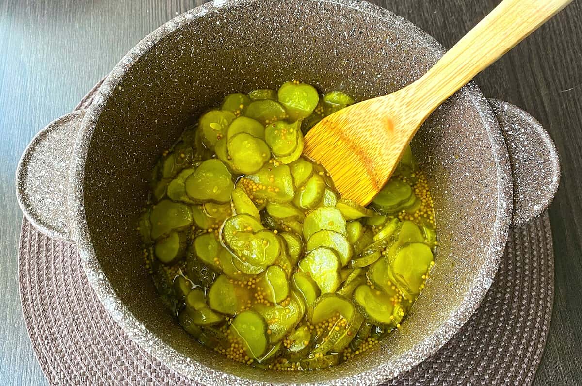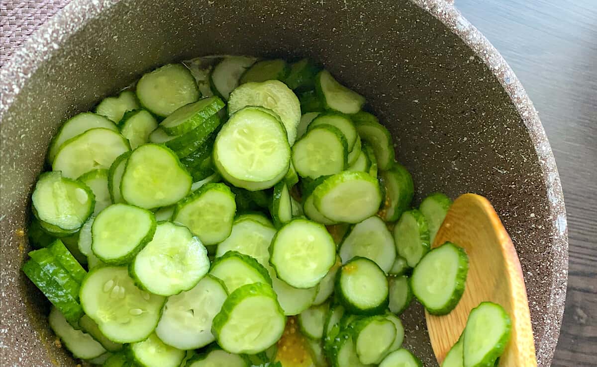 У процесі постійно помішувала. Огірки повинні поміняти колір і злегка розм’якнути.