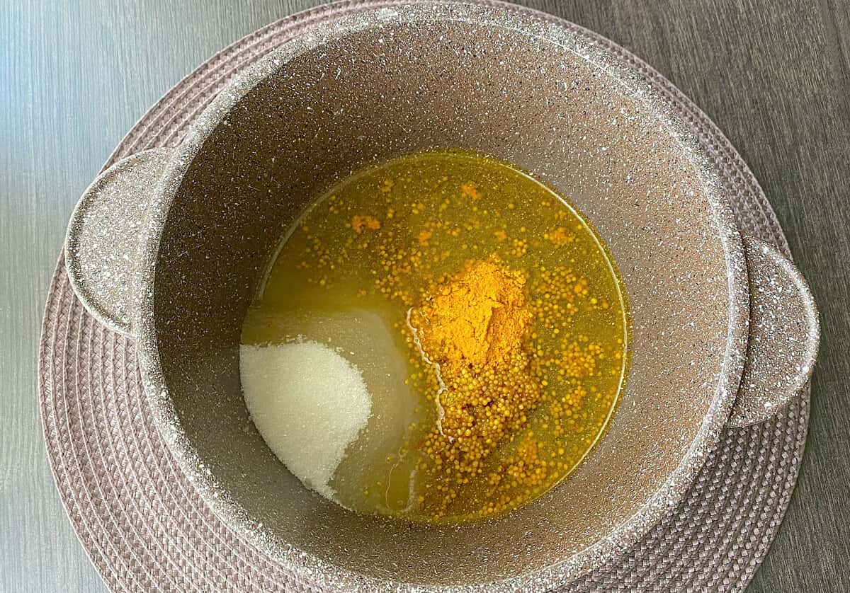 У сотейник влила яблучний оцет, додала зернисту гірчицю, цукор і куркуму.