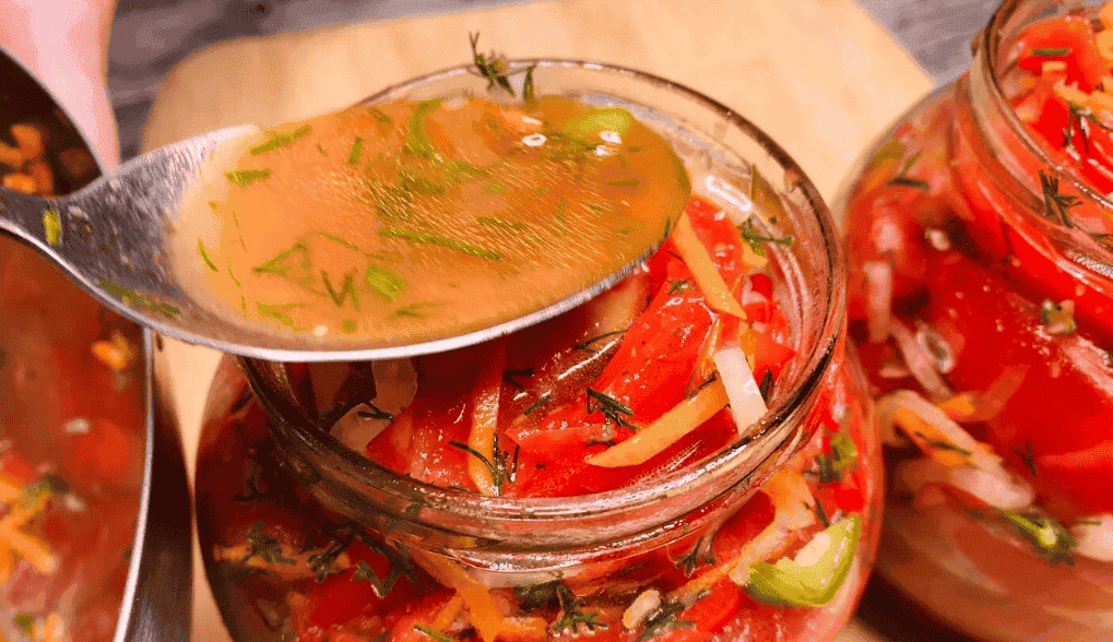 Розкладаємо салат по стерилізованих банках. Сік, що виділився, розливаємо по банках доверху.