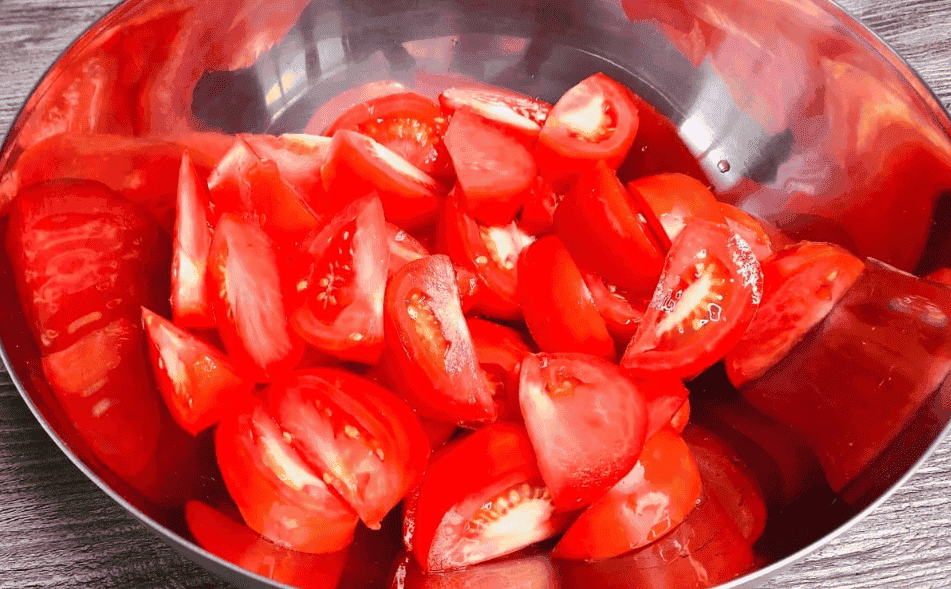 1. Помідори ріжемо на часточки середнього розміру та відправляємо у ємність.