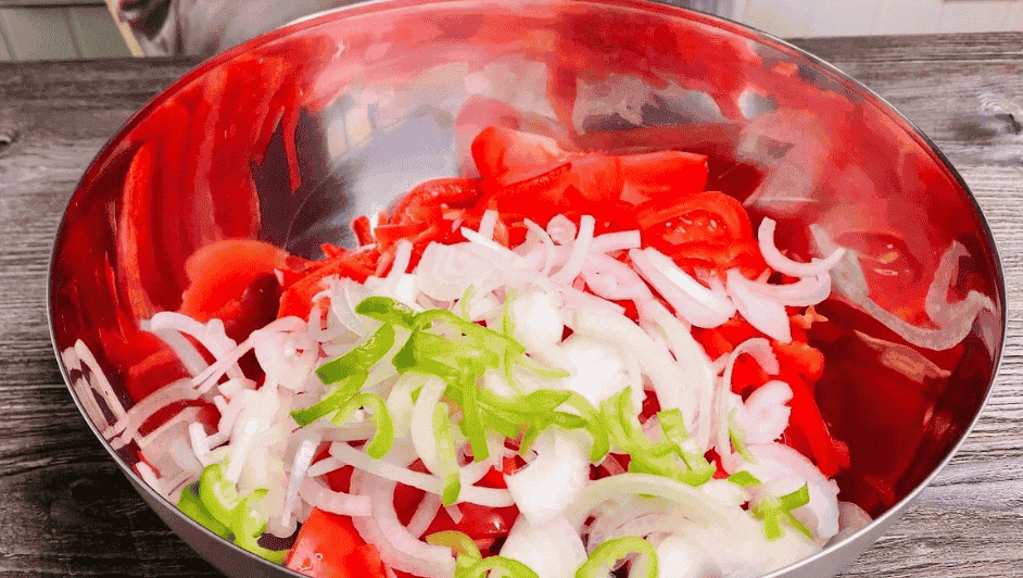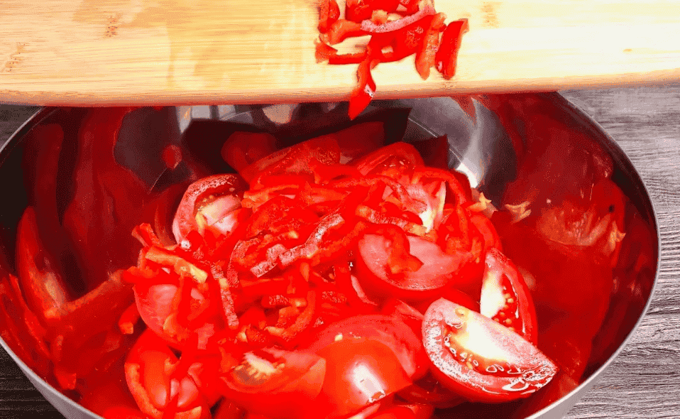 2. Солодкий перець нарізаємо соломкою та відправляємо до помідорів.