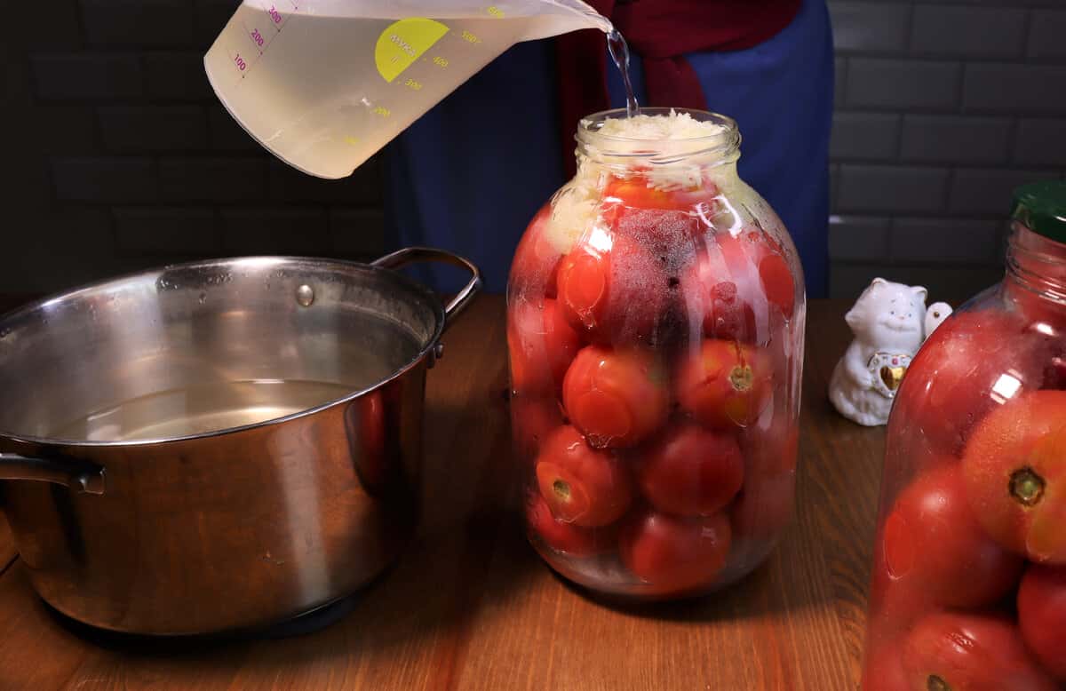І заливаю банки з помідорами готовим киплячим маринадом до верху, щоб під саме горлечко.