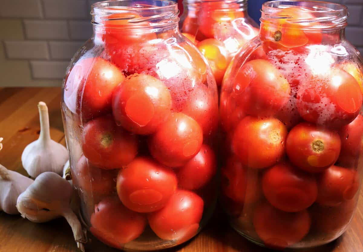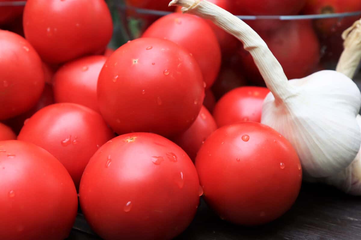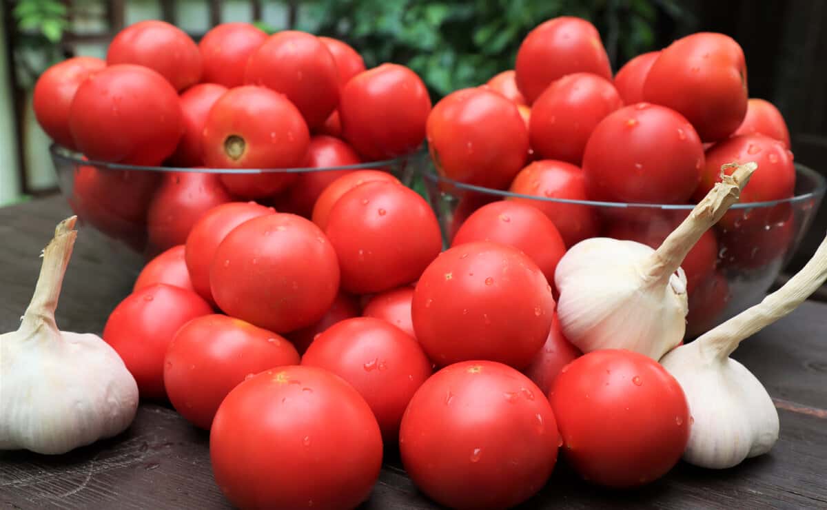 З основних продуктів знадобляться, власне, самі помідори і багато часнику. Помідорки краще вибирати ті, що м’ясисті, особливо хороший сорт “сливка”. Часник краще брати домашній. Якось купила я китайський часник, він позеленів в банці, виглядало не дуже, хоча на смак не вплинуло.