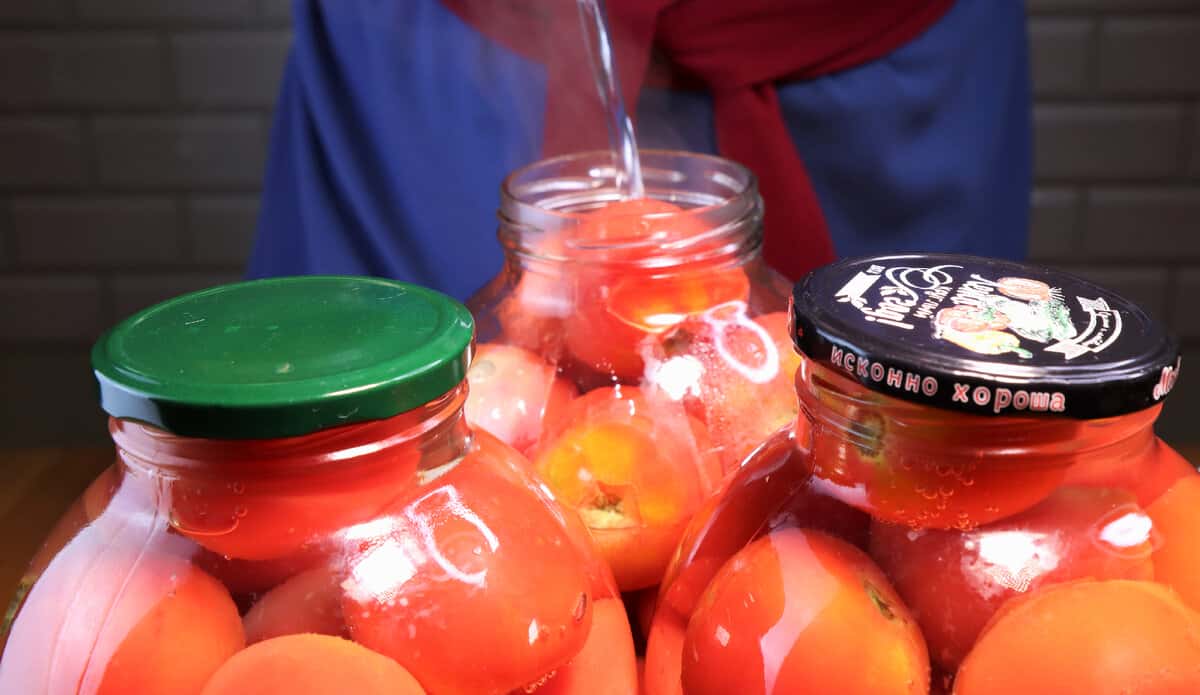 Помідори укладені, заливаю їх окропом. Щоб вже банка напевно не лопнула, наливаю спочатку зовсім небагато води, на дно, протягом декількох хвилин баночка прогріється і не лопне.