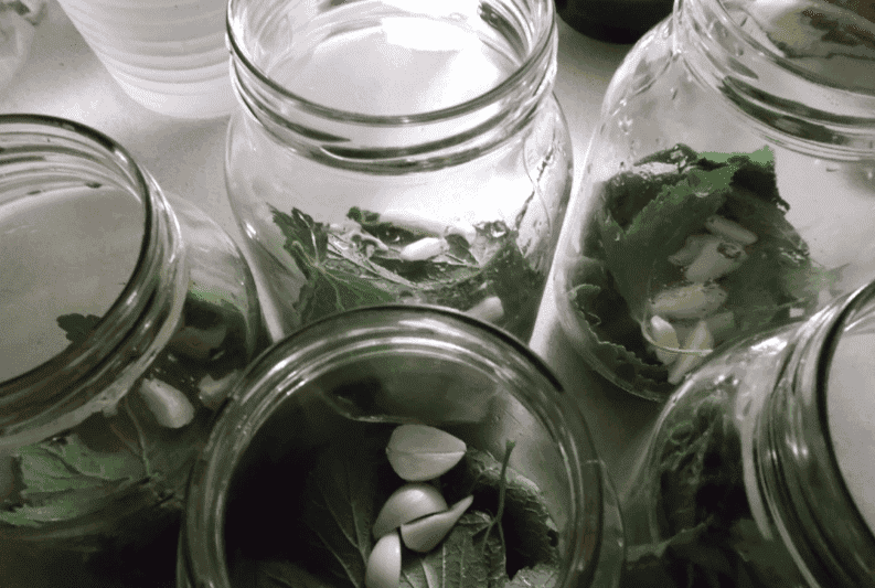 На дно вимитих банок я укладаю 1 листок хрону (можна використовувати корінь), 3 листки смородини та 2 порізані зубчики часнику. Так само можна додати чайну ложку насіння кропу або гілочку кропу. Іноді я додаю гілочку селери, яка надає консервованим помідорам приємного пряного смаку. У принципі, в консервацію можна додавати всі улюблені приправи – лавровий лист, чорний перець, запашний перець тощо.
