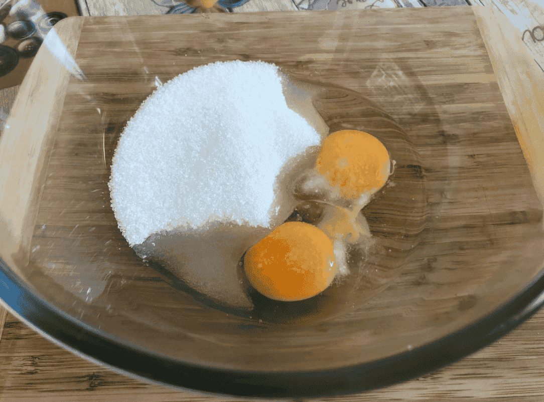 У миску розбиваємо 2 яйця, додаємо щіпку солі, цукор, щіпку ваніліну (або 1 ч. л. ванільного цукру) і збиваємо близько 2-3 хвилин, щоб розчинився цукор, а маса стала пишною.
