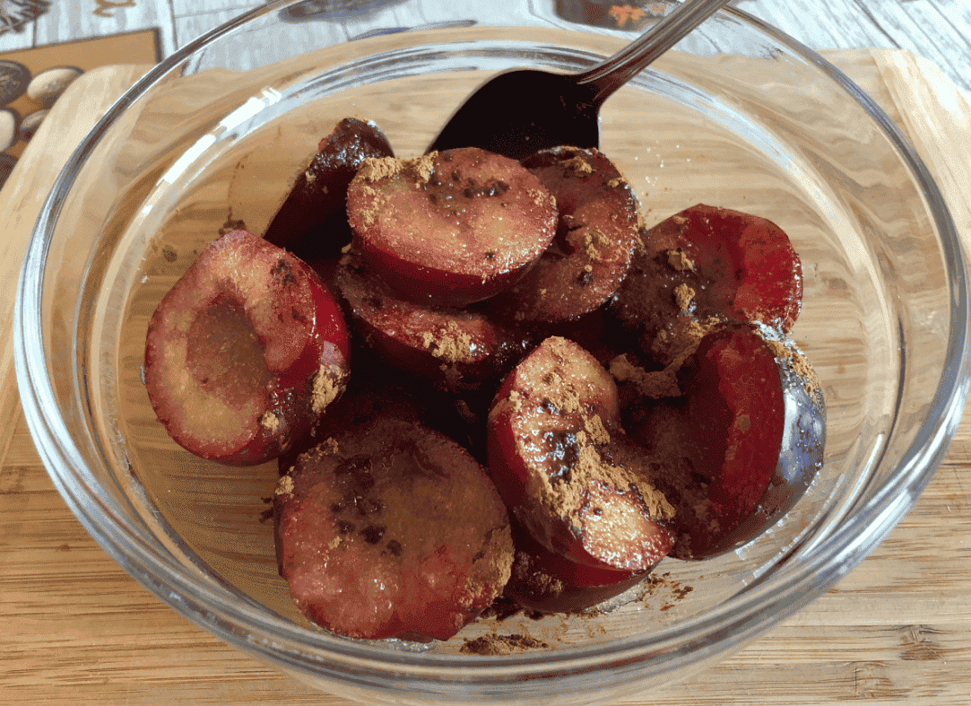 Сливи розрізаємо навпіл, виймаємо кісточки. До слив додаємо цукор і 0,5 ч. л. кориці та 1 ст. л. коньяку (за бажанням).