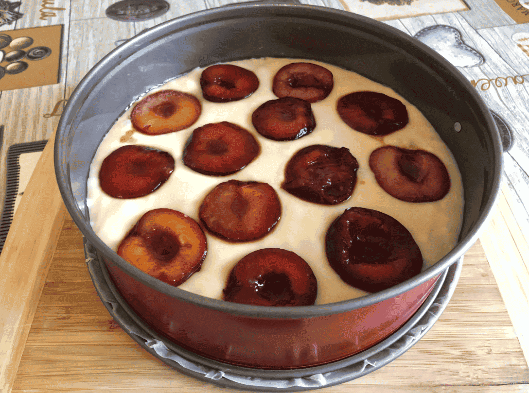 Зверху викладаємо сливи зрізом вгору. Зверху присипаємо цукром, що залишився з корицею.