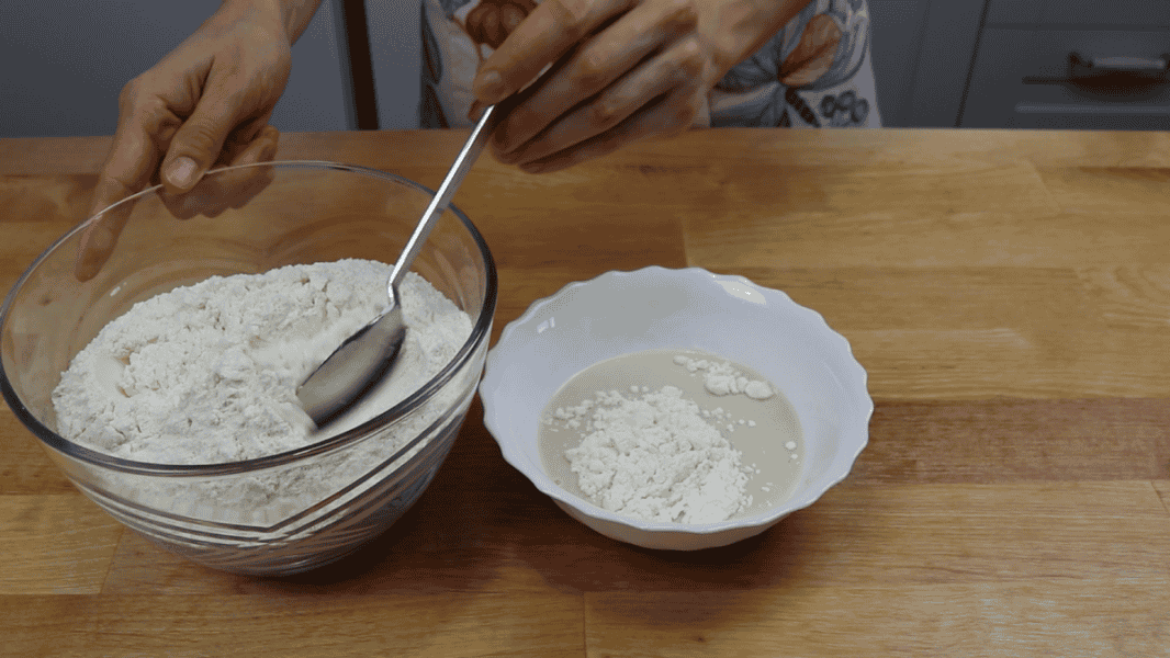 Готую тісто: Опара – змішую дріжджі, теплу воду та 2 ст.л. борошна. Залишаю на 15 хвилин.
