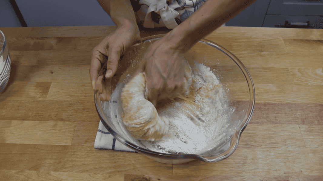Коли тісто збереться в грудку, стіл присипаю борошном, що залишилося, викладаю тісто і вимішую 5-7 хвилин.