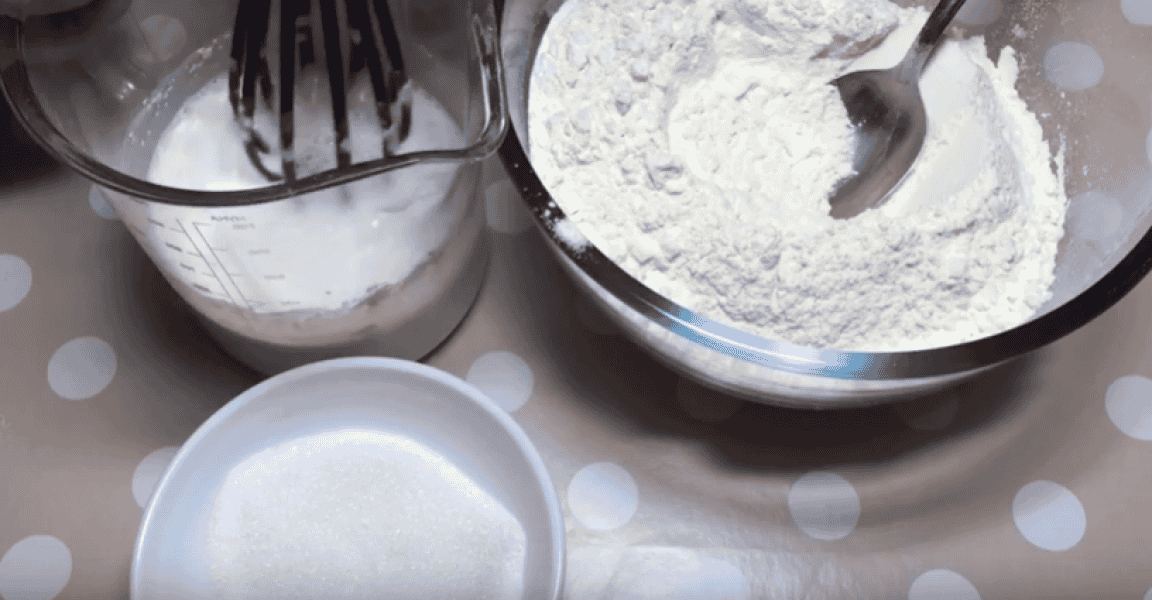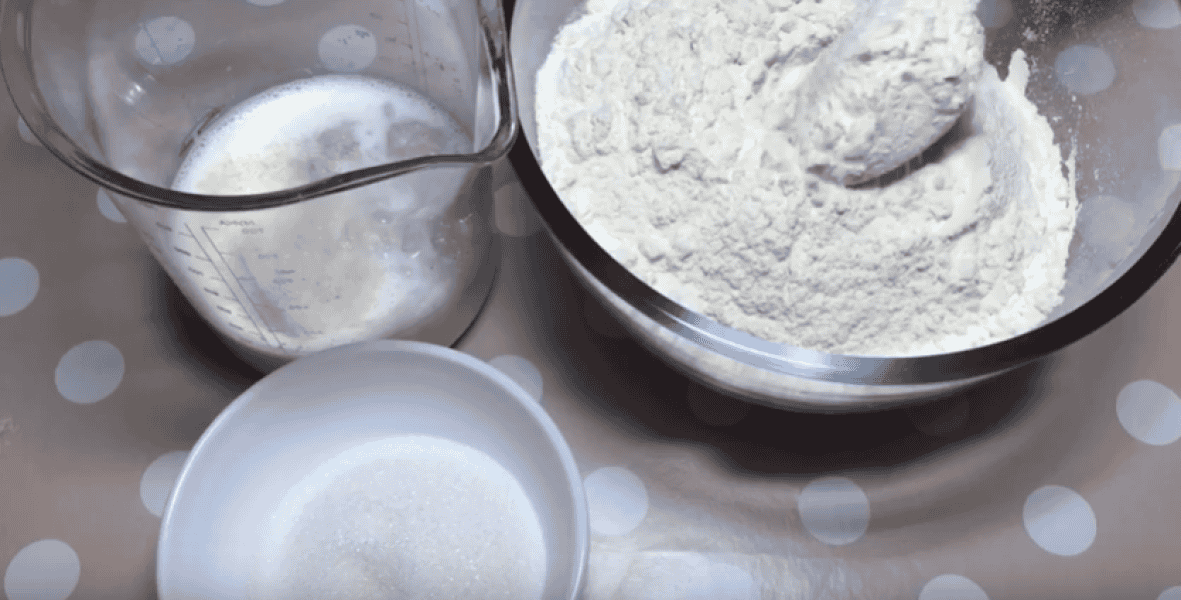 У тепле молоко всипаємо швидкорозчинні дріжджі, додаємо 2-3 ст л борошна від загальної кількості, 1 ст л цукру, також від загальної кількості, перемішаємо і залишаємо на 15 хвилин, щоб дріжджі активувалися.
