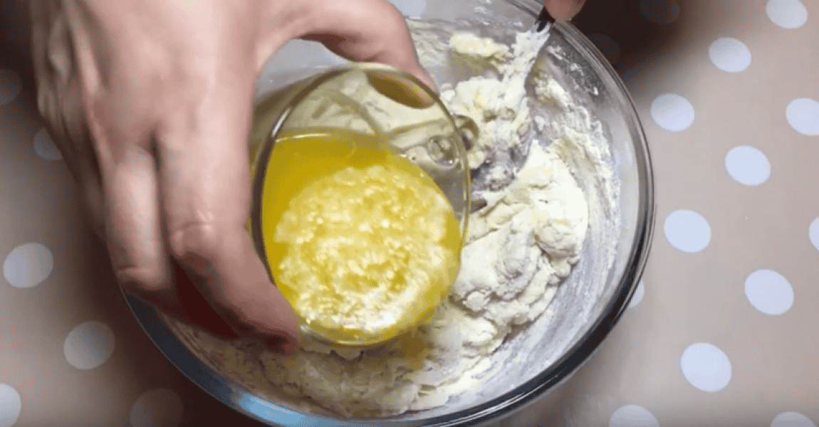 Борошно увібрало всю рідину, додаємо тепле розтоплене вершкове масло, замішуємо тісто.