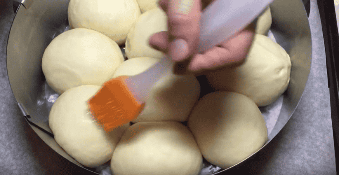 Яйце збиваємо до білого і зверху змащуємо булочки, що відстоялися.