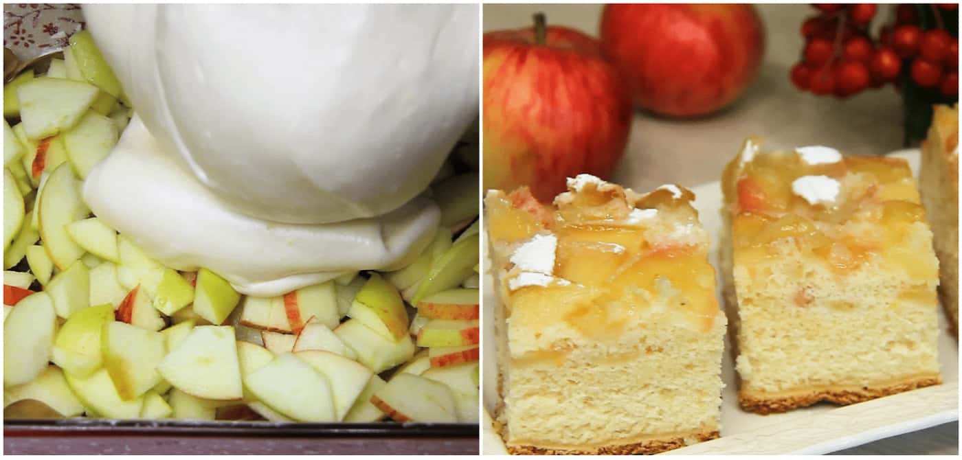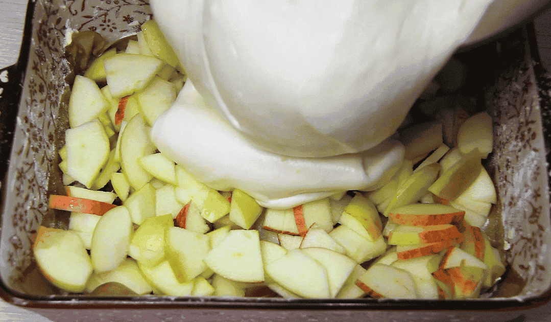 Зверху рівномірно залийте яблука тістом