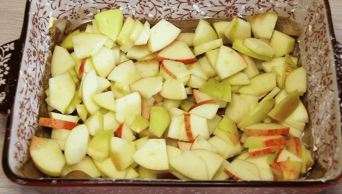 На дно форми для запікання рівним шаром покладіть шматочки яблук (дно форми застелити пергаментом, боки змастити олією та присипати борошном). За бажанням яблука можна перемішати з невеликою кількістю кориці.