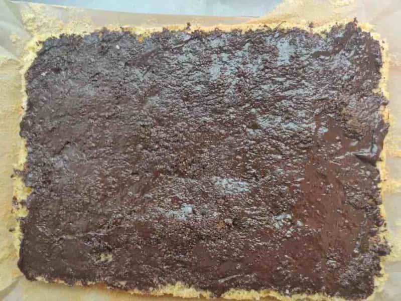 Для просочення шоколадом нам потрібно шоколад розтопити разом з молоком на повільному огні чи водяній бані. Тепер промазуємо два бісквітні коржі з обох сторін шоколадом.
