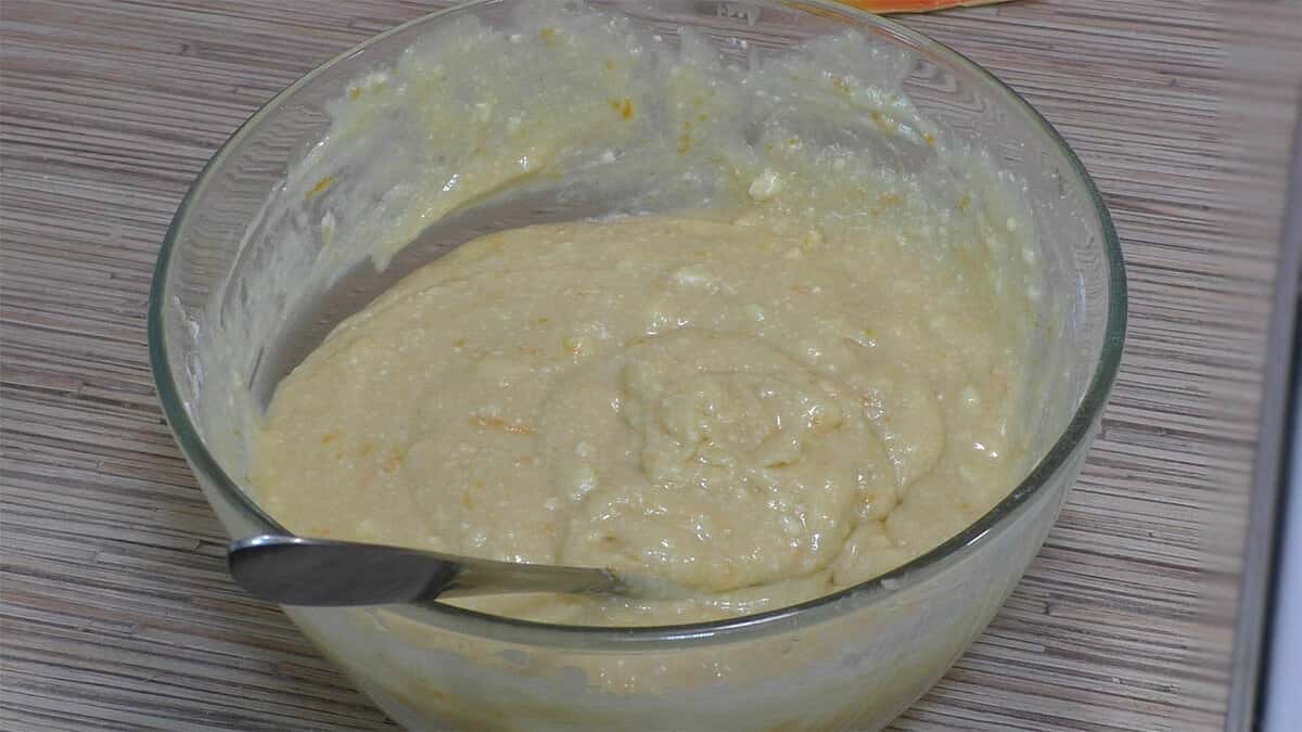 Додаємо туди 3 яйця і все перемішуємо. Вливаємо туди апельсиновий сік, викладаємо апельсинову цедру і знову все розмішуємо.
