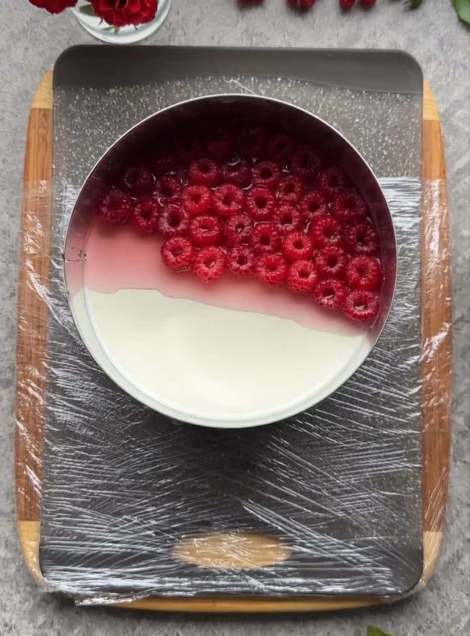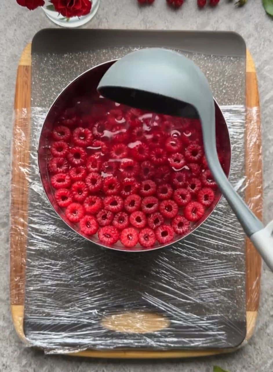 Встановити кільце вертикально. Викласти малину на два заходи і залити ягідною рідиною на два заходи, щоб не спливали ягоди.