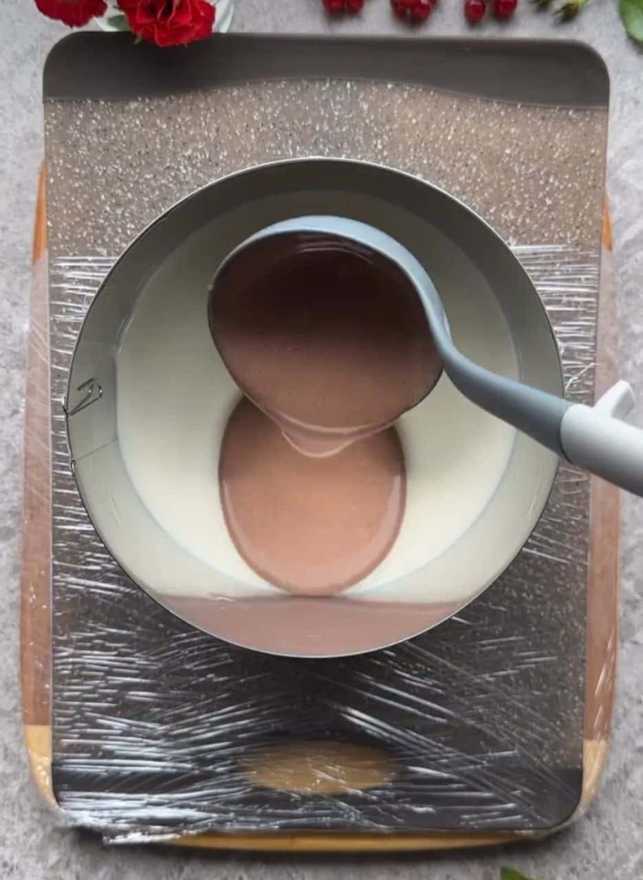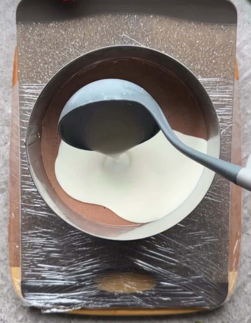 Переставити кільце на протилежний бік. Якщо шоколадна маса застигла, трохи нагріти, постійно помішуючи вінчиком. Влити шоколадний шар, потім вершковий (теж нагріти).