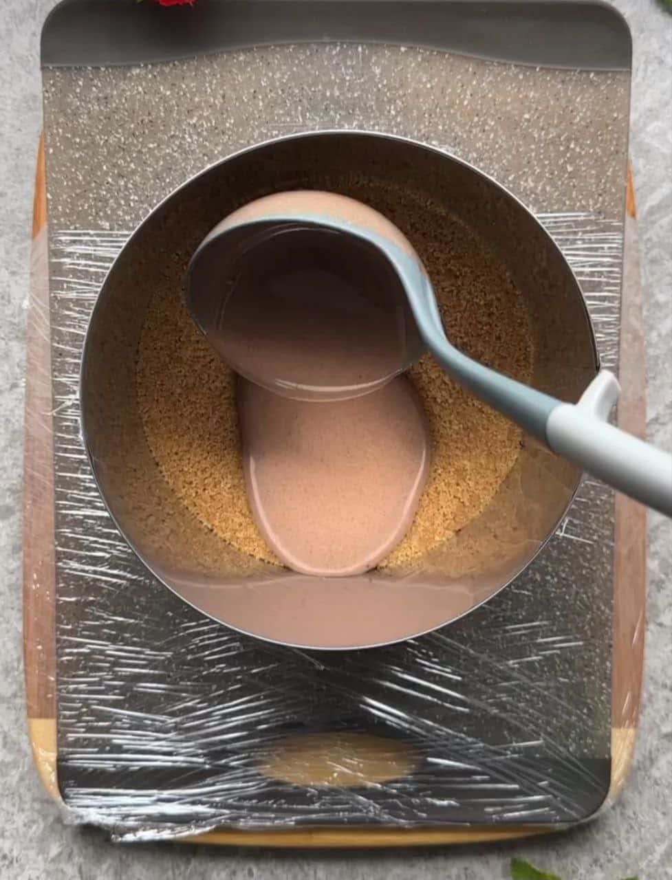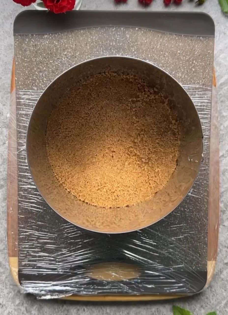 ОСНОВА. У крихту з печива влити розтоплене вершкове масло, перемішати. Висипати у кільце, ущільнити.