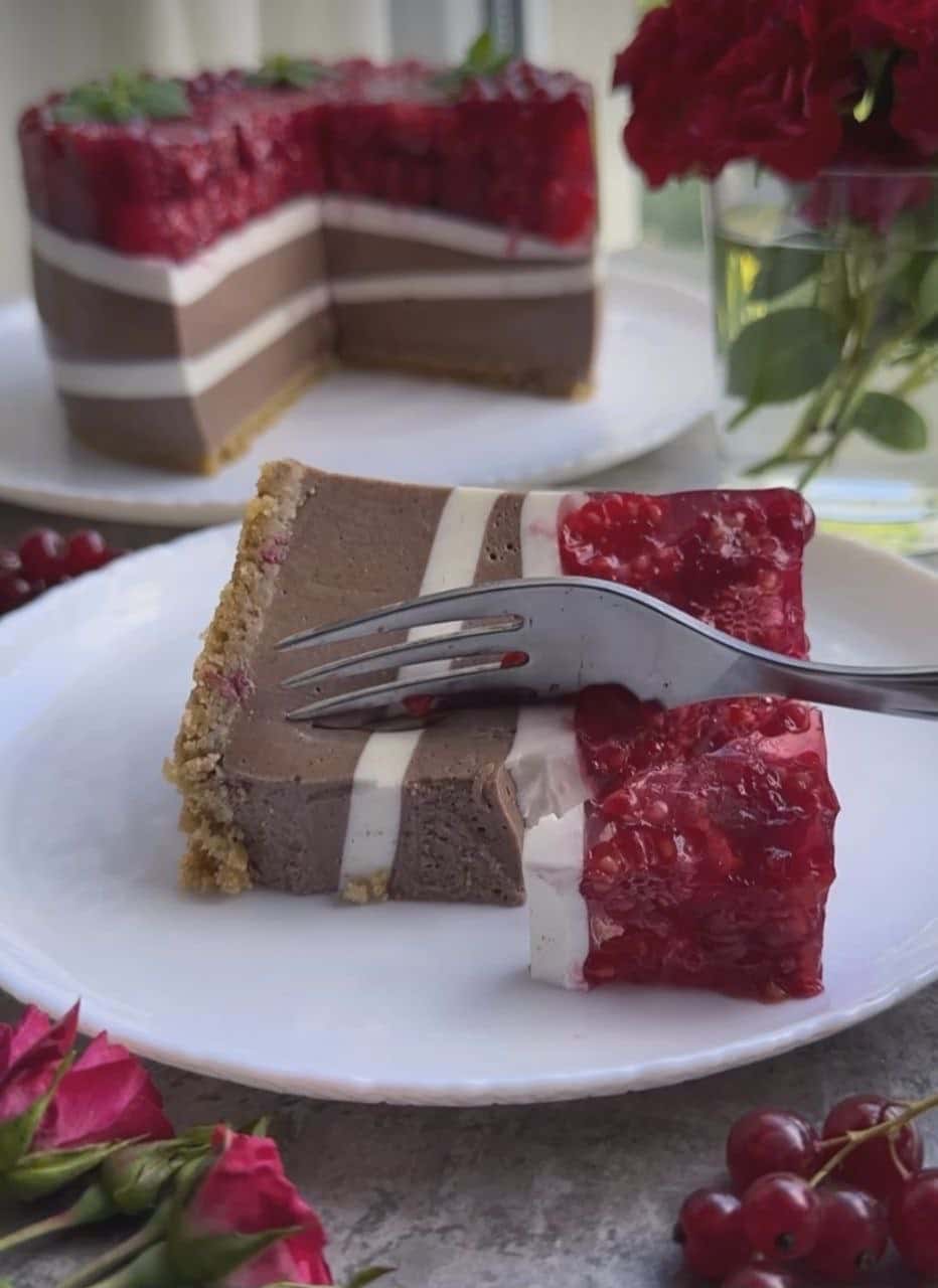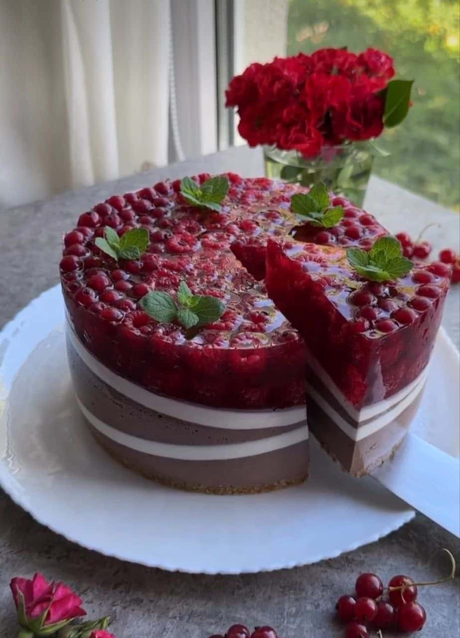Відправити у холодильник мінімум на 4 години. Перед подачею прикрасити мелісою або за бажанням. Нарізаємо порційно та насолоджуємось 😍 ніжним і дуууже смачним десертом без випічки.
