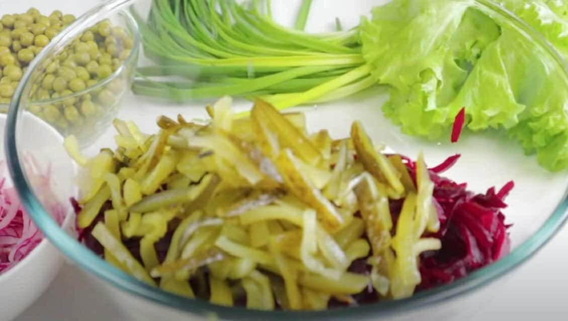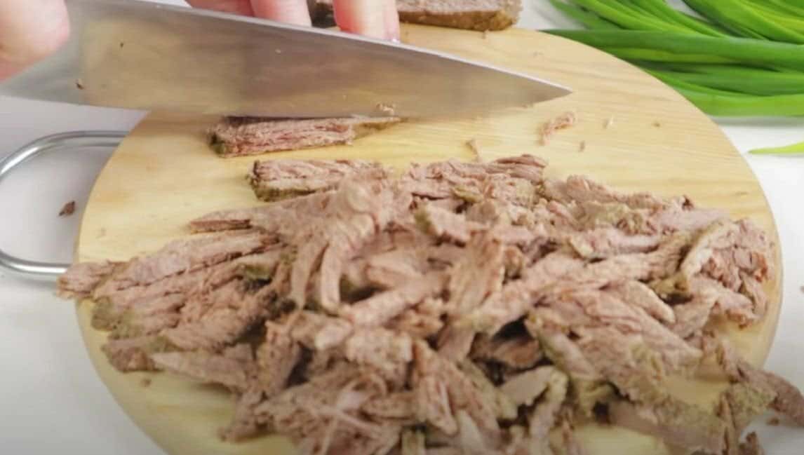 Яловичину відваримо і наріжемо соломкою. Цей салат особливо смачний саме з яловичиною.
