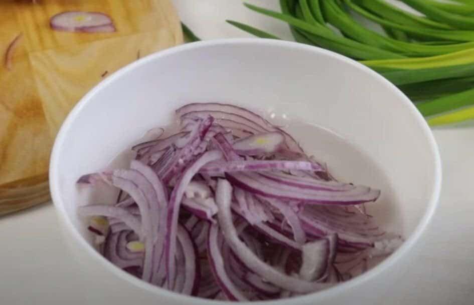 Замаринуємо цибулю: змішаємо яблучний оцет і воду. Помістимо нарізану цибулю в розчині на той час, поки готуємо інші інгредієнти.
