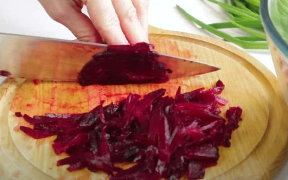 Буряк заздалегідь запікаємо в духовці в фользі 40 хвилин. Або можна приготувати в мікрохвильовці. Наріжемо буряк соломкою ( натирати на терці не рекомендую ).