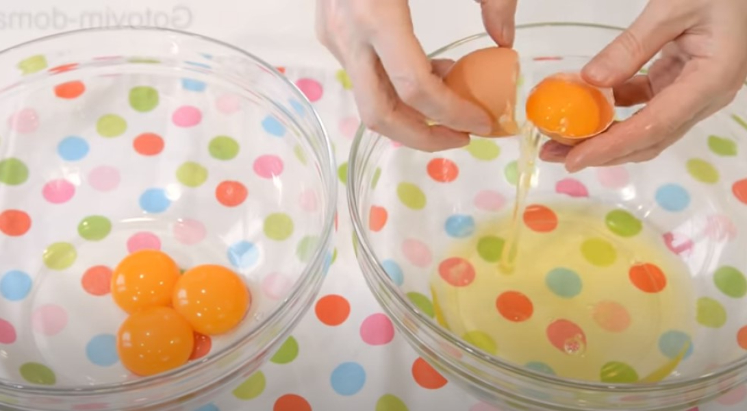 Жовтки змішуємо із сіллю та цукром, збиваємо міксером до стійкої та пишної маси.