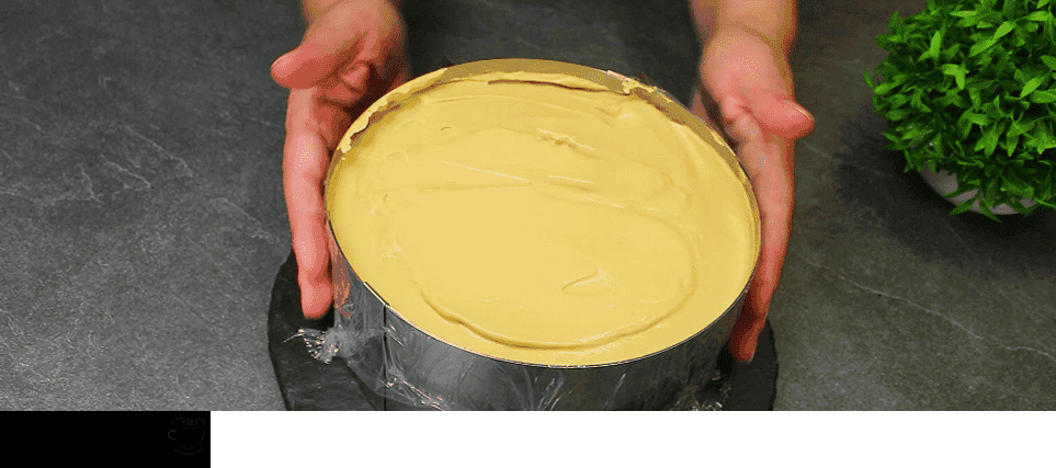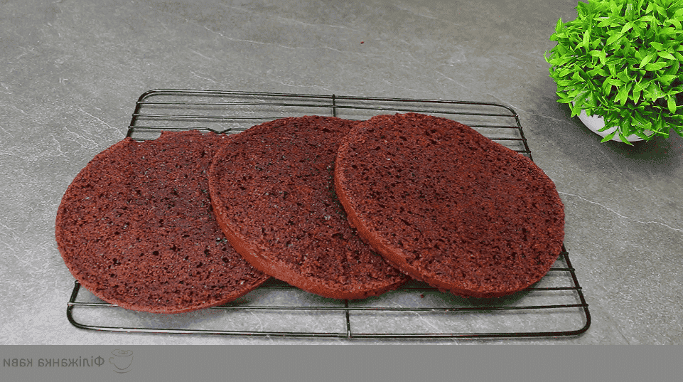 Збираємо торт, змащуючи коржі кремом, відкладаємо 2 столові ложки крему для змащування боків торта. Накриваємо торт харчовою плівкою і забираємо в холодильник хоча б на 1 год.