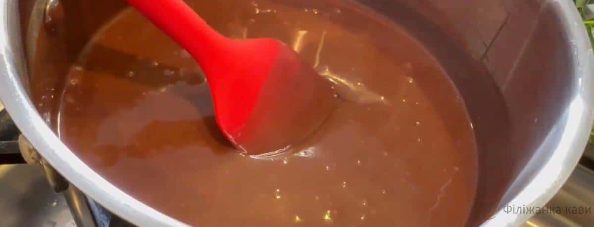 Варимо на середньому вогні, дві-три хвилини, постійно помішуючи і виливаємо зверху на шоколадний шар. Ставимо в холодильник на одну годину.
