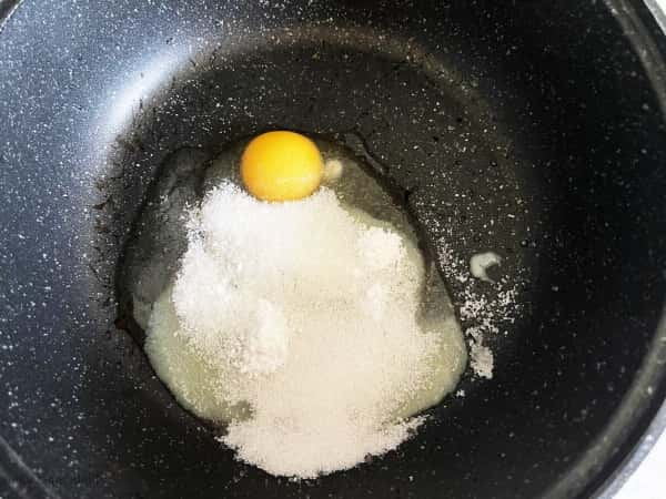 1 ) Нам знадобиться товстостінна каструля. У каструлю відправляємо одне яйце, 3 столових ложки цукру, соду і мед.