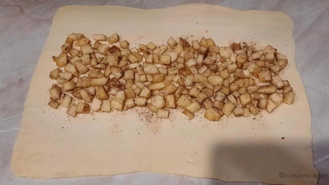 Туди ж викласти нарізані яблука з цукром і корицею і закрити з 2-х сторін, защипуємо краї. Теж саме виконати і з другим пластом.