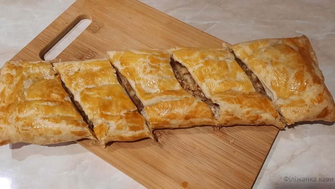 Як штрудель пропікся і підрум’янився витягнути, дати охолонути трохи і нарізати на шматочки.