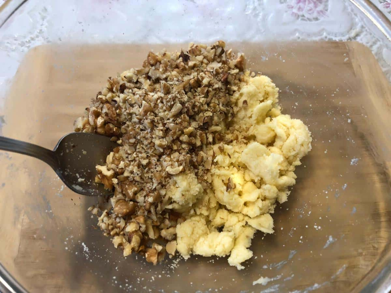 Горіхи (у мене волоські) подрібнюємо ножем і додаємо до 1/3 відкладеного тіста і добре перемішуємо.