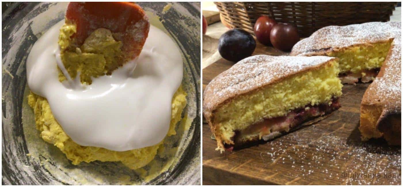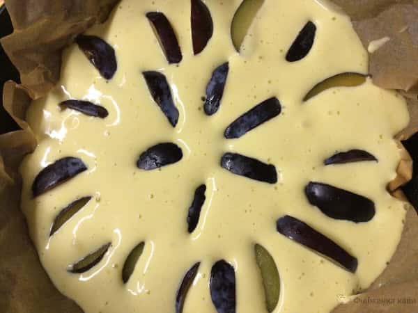 Заливаємо фрукти другою половиною тіста і зверху розкладаємо ще трохи сливи.